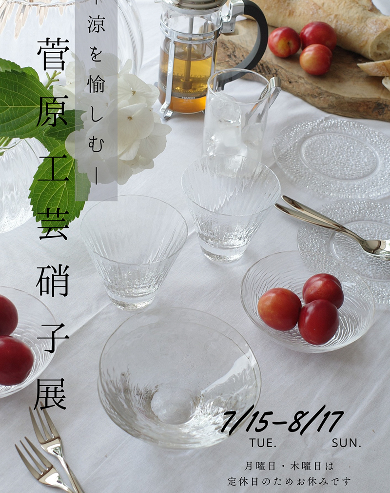 店内には、インテリアショップ「siroji」からご用意いたしました菅原ガラスさんの涼しげなガラス食器が並んでおります。